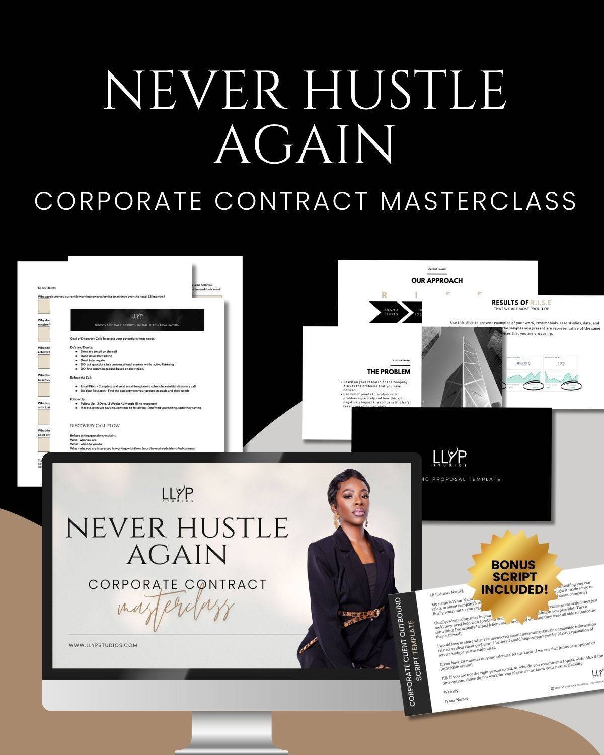 The Never Hustle Again Corporate Contract Masterclass (templates included!) is for consultants, freelancers, and service providers who are ready to stop hustling and chasing small projects and start landing $10k+ contracts with one aligned client.